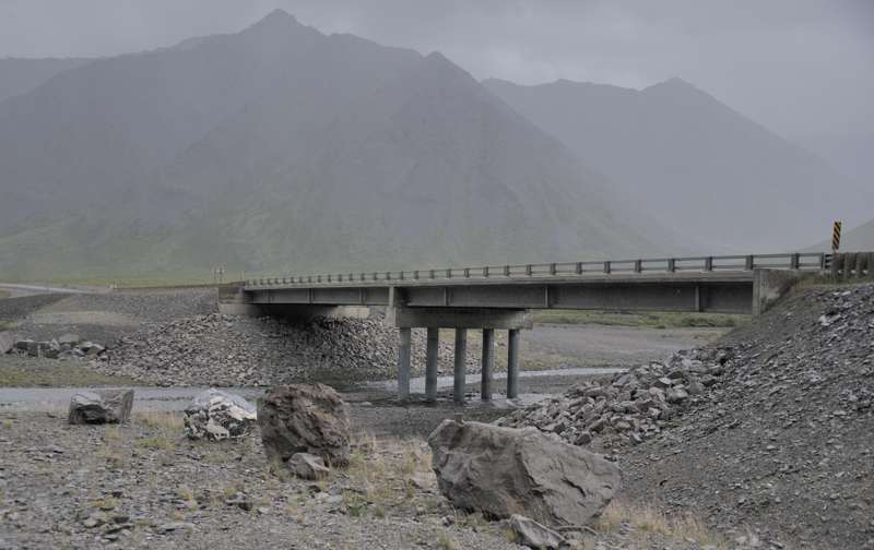 One of several bridges over the Atigun River. I think this is bridge #1, just north of mile 253. (July 2012)