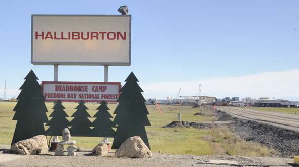 I don't know if the am/pm sign or the sculpture were still there when I revisited Prudhoe Bay in 2012 (maybe the guide took a different route to the beach). But I did see this humorous sign in front of the local office for Halliburton, which provides support services to the oil production companies. The "Prudhoe Bay National Forest" joke is that there are no natural trees on the coastal plain anywhere near Prudhoe Bay -- not with permafrost too close to the surface for trees to survive. (July 2012) |