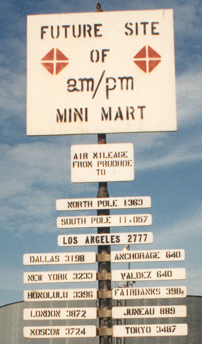 I found this sign, past the end of the highway, rather ironic. In California, am/pm stores are good places for cheap gasoline. Up here in Prudhoe Bay, however, it's extraordinarily expensive (over $2/gallon regular unleaded when I was there in 1994, reportedly around $5.35/gallon in September 2008, and over $5/gallon in July 2012, all well over lower-48 averages), even atop one of the world's largest oil fields. With no refinery facilities at Prudhoe Bay, gasoline has to be refined elsewhere and then trucked back up here over the Dalton Highway. (July 1994) |